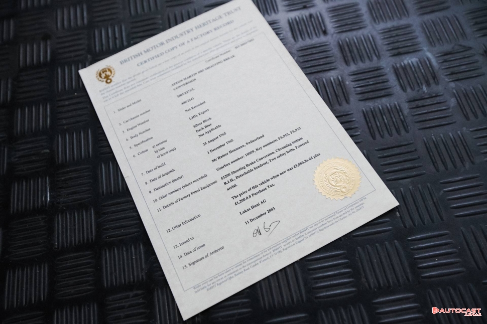 1965년 섀시 번호 DB5/2273/L의 이 그 중 하나이며, 처음에서부터 지금까지 스위스 오너 3명의 과거를 거쳤다. 그리고 마침내 오는 8월 15일 RM 소더비의 몬테레이 경매에서 판매에 부쳐진다. 이 차가 만들어졌을 당시 "영국의 집 평균 가격의 약 2배"였다는 것을 감안할 때 경매가액을 어느 정도 예상할 수 있겠지만 아직 시작가격이 공개되지는 않았다.